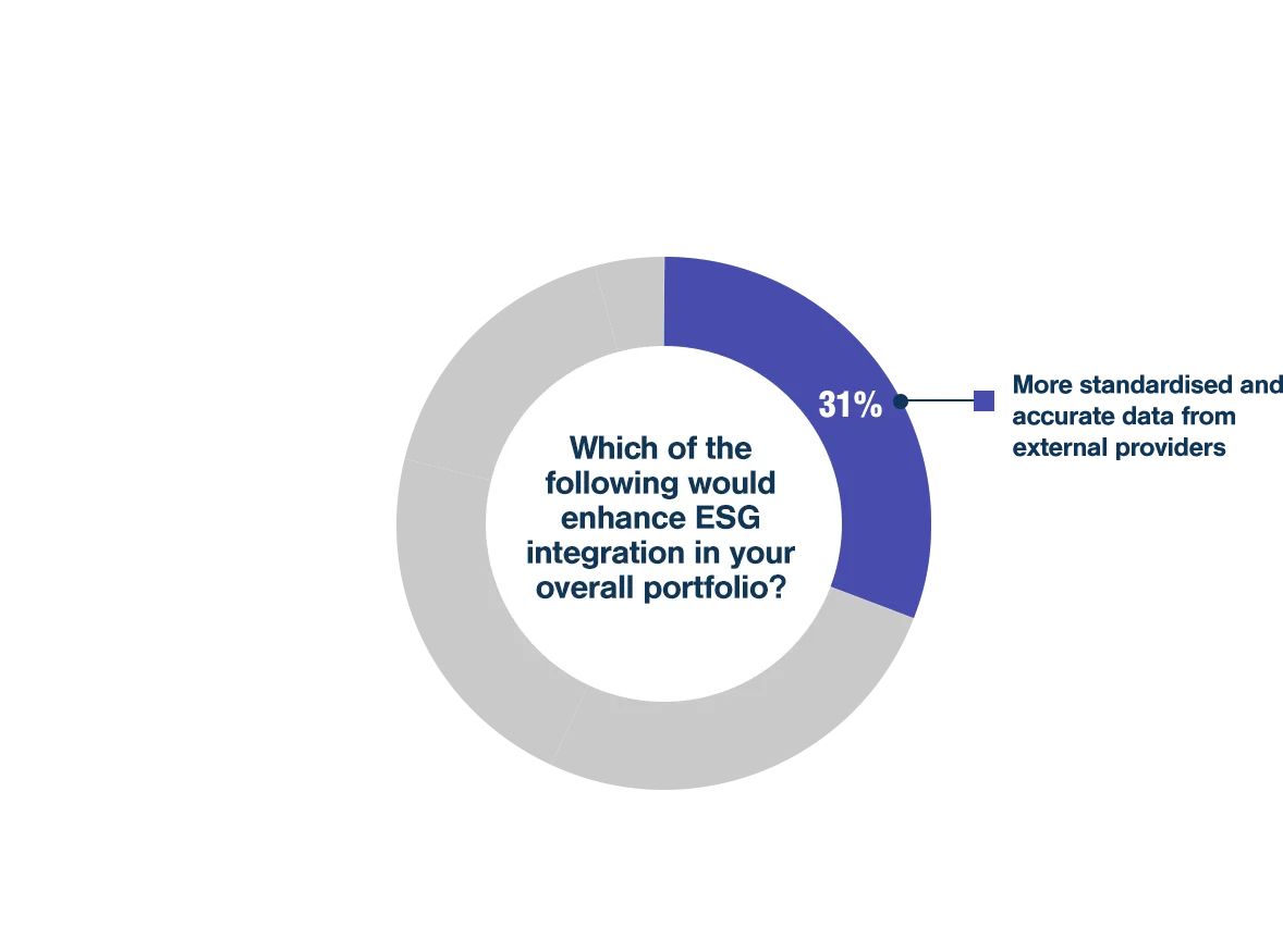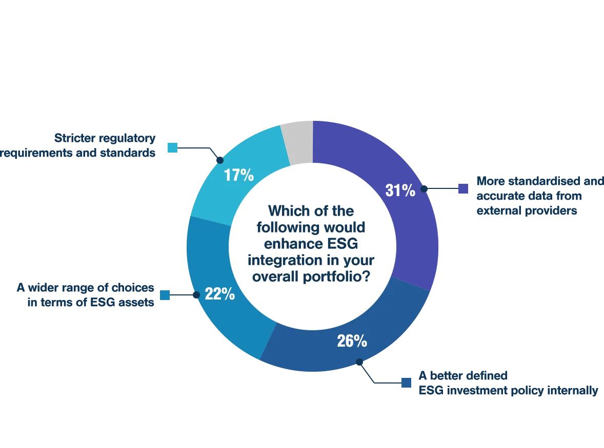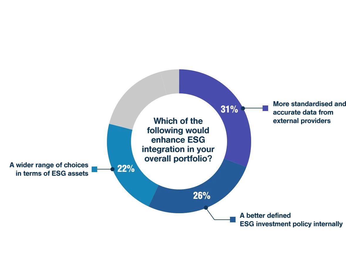To make the role of ESG — and its integration — more prominent in the overall portfolios of investors, however, most respondents said they either need more standardised and accurate data from external providers, or simply a better defined ESG investment policy internally.