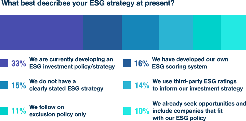Around a third of them are developing an ESG investment policy at the moment, with some having created their own ESG scoring system and others outsourcing to third-party ESG ratings providers to inform their strategy.