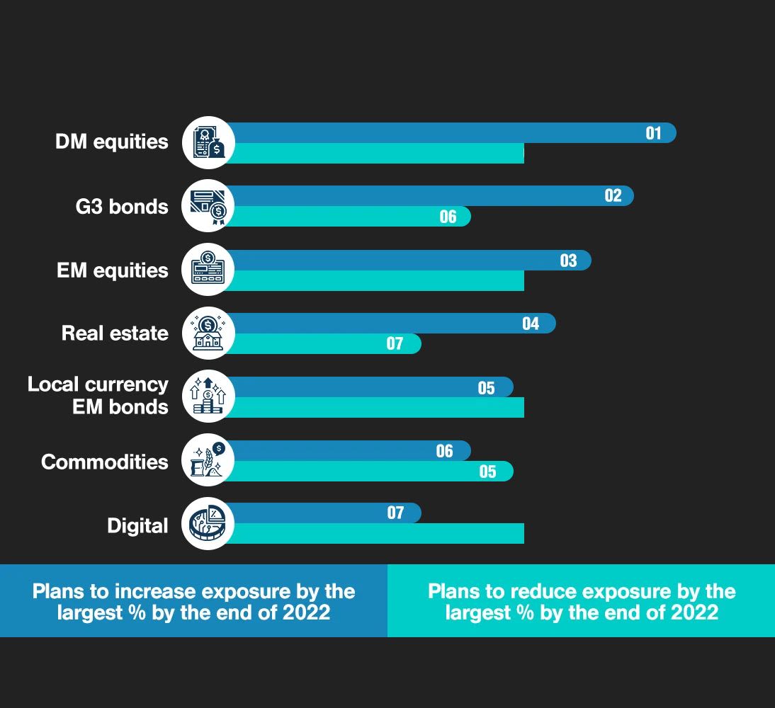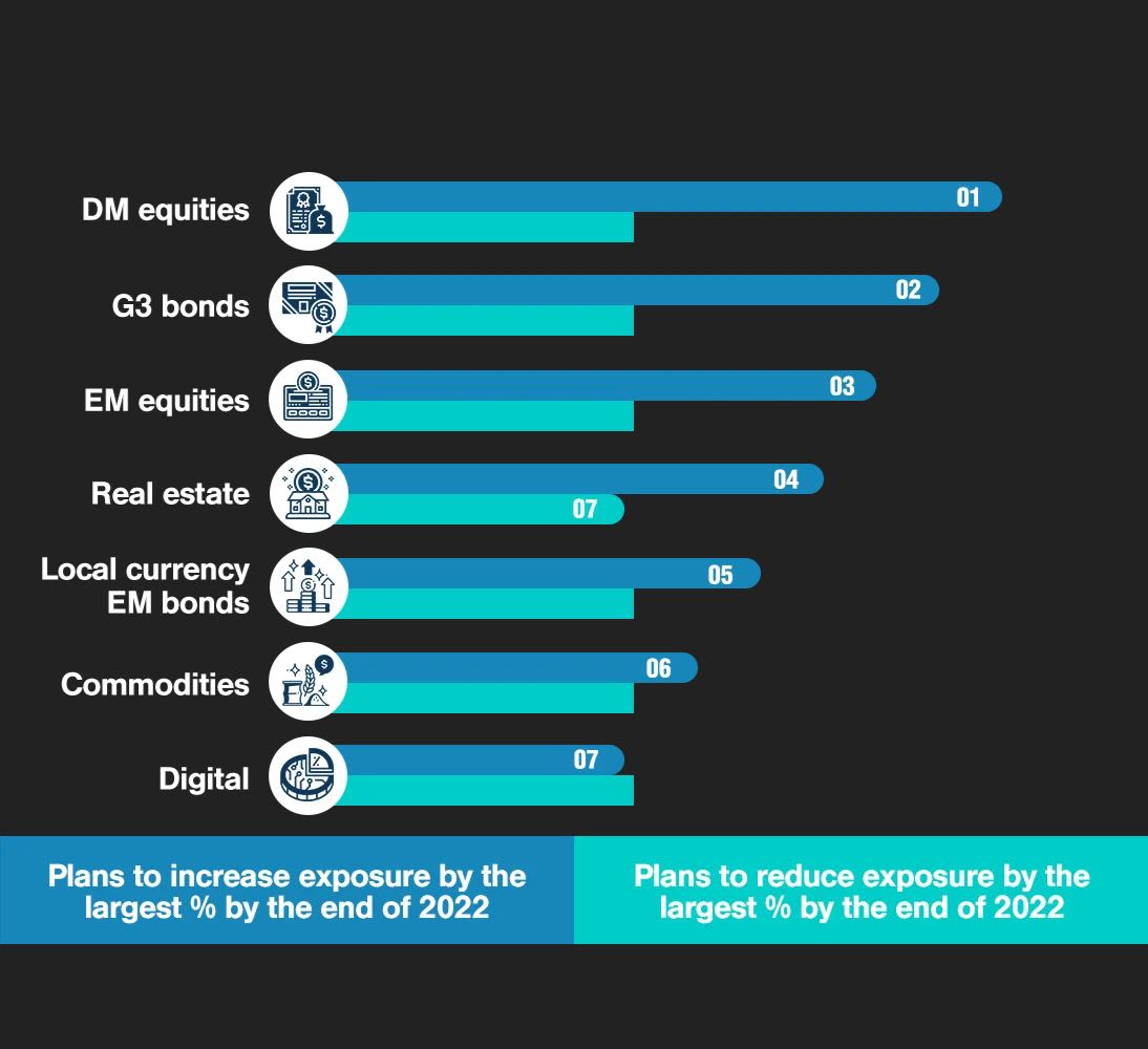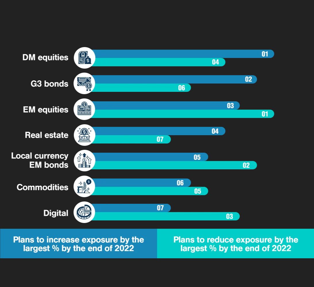 Based on these investment goals and criteria, survey responses indicated that flows into developed markets equities and G3 bonds may grow between now and the end of 2022.