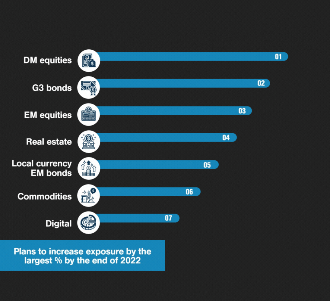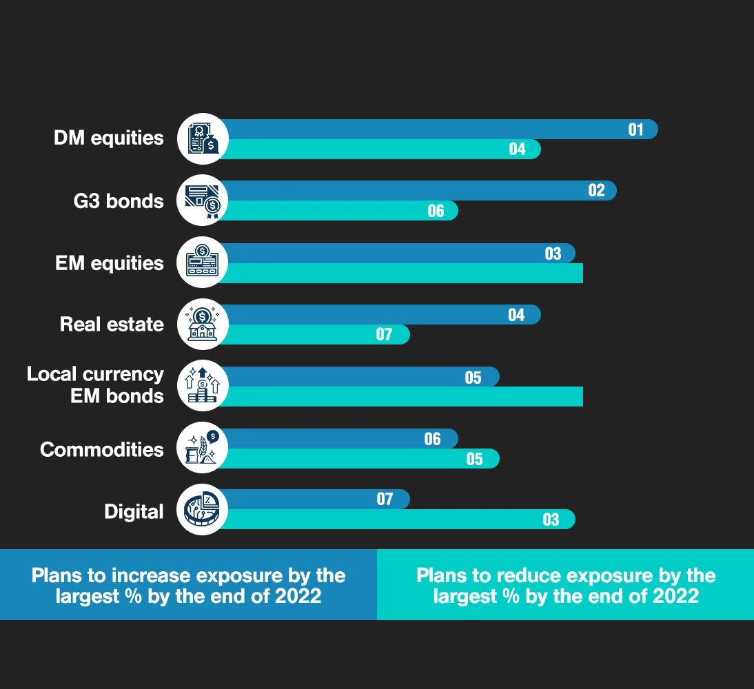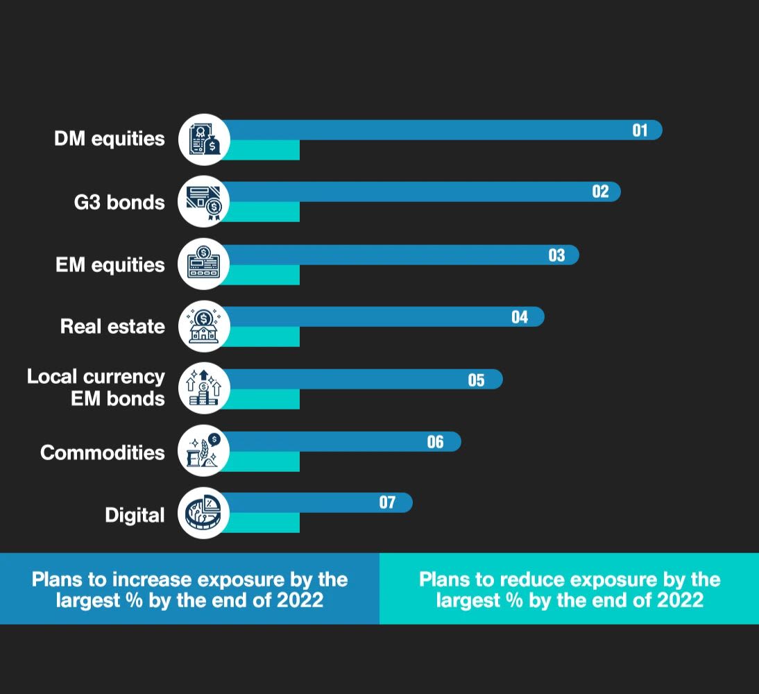 Based on these investment goals and criteria, survey responses indicated that flows into developed markets equities and G3 bonds may grow between now and the end of 2022.