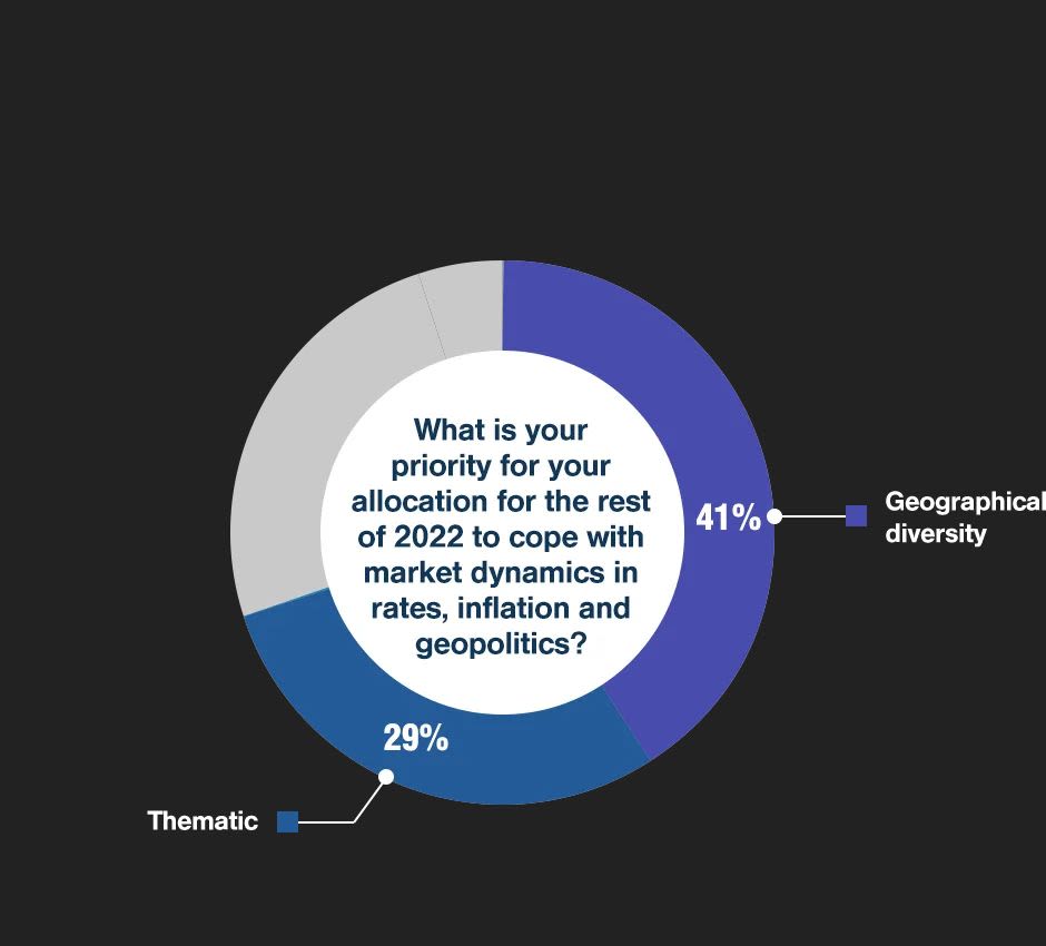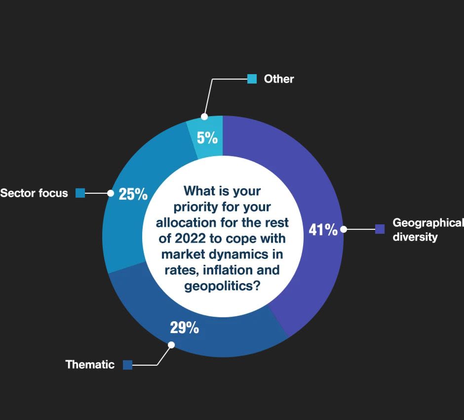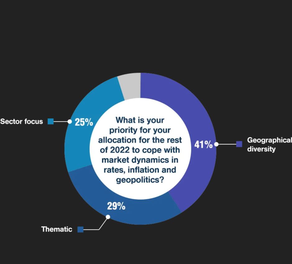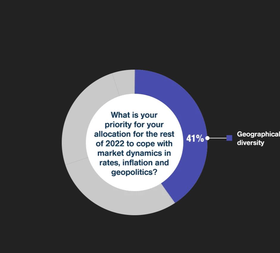 Driving these allocation decisions, the majority of respondents believe geographical diversity will be most effective in enabling them to cope with today’s environment in terms of rates, inflation and geopolitics.